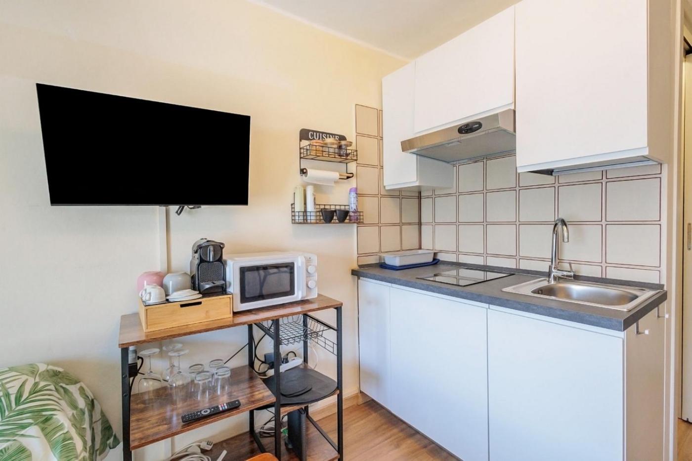 Questo appartamento presenta una TV a schermo piatto. Langolo cottura dispone di frigorifero, microonde e piano cottura più macchina da caffè.