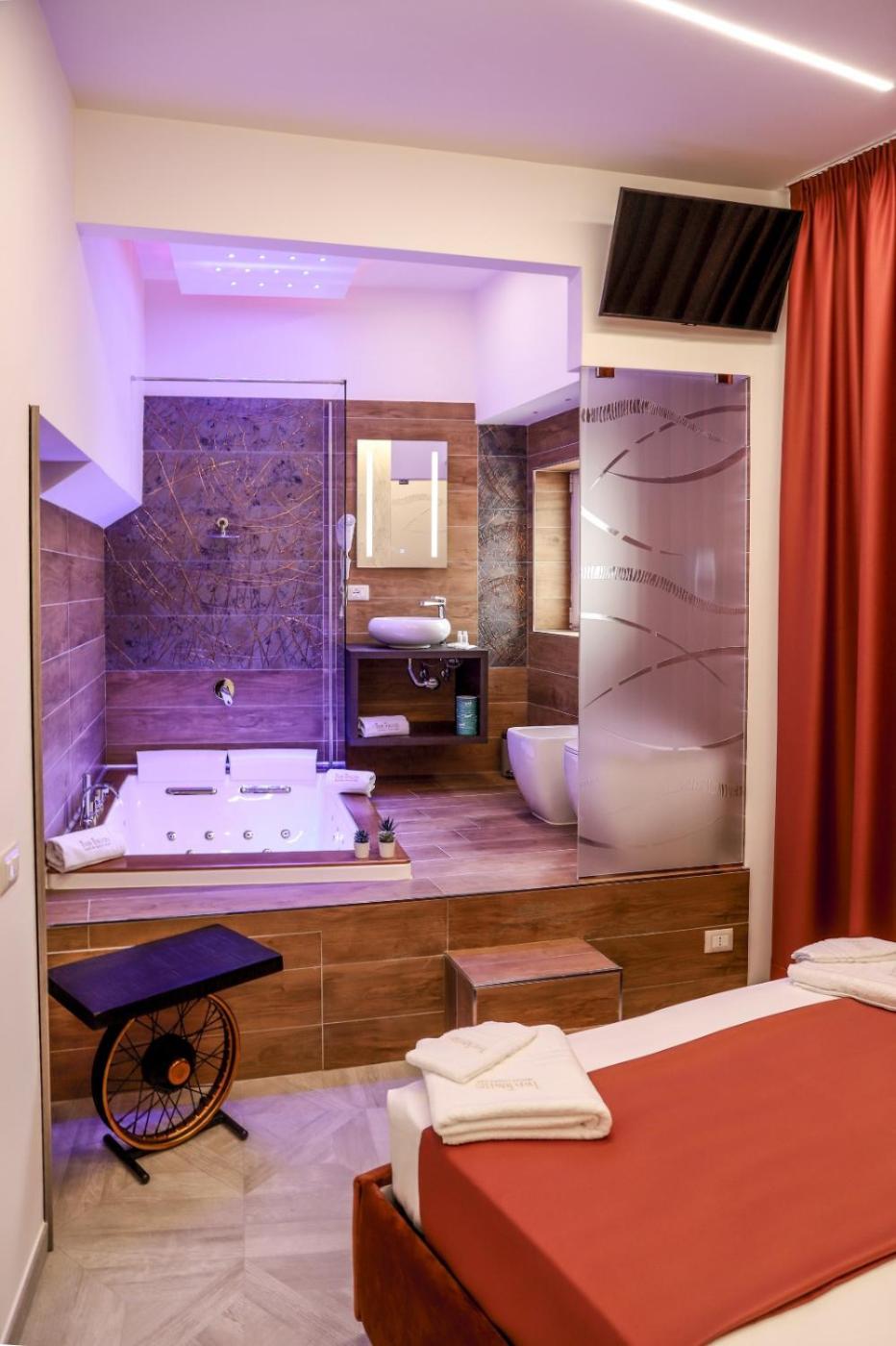 Camera Queen con Vasca Idromassaggio. This double rooms standout feature is the hot tub. Offering free toiletries and bathrobes, this double room includes a private bathroom with a bath, a shower and a bidet. The well-equipped kitchen has a stovetop, a refrigerator, a dishwasher and kitchenware. The air-conditioned double room offers a flat-screen TV, soundproof walls, a tea and coffee maker, a dining area as well as city views. The unit has 1 bed. ;